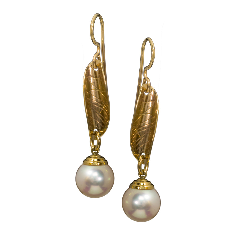 Small gold flower petals move and dance and show off Large Gorgeous white Freshwater Pearls.