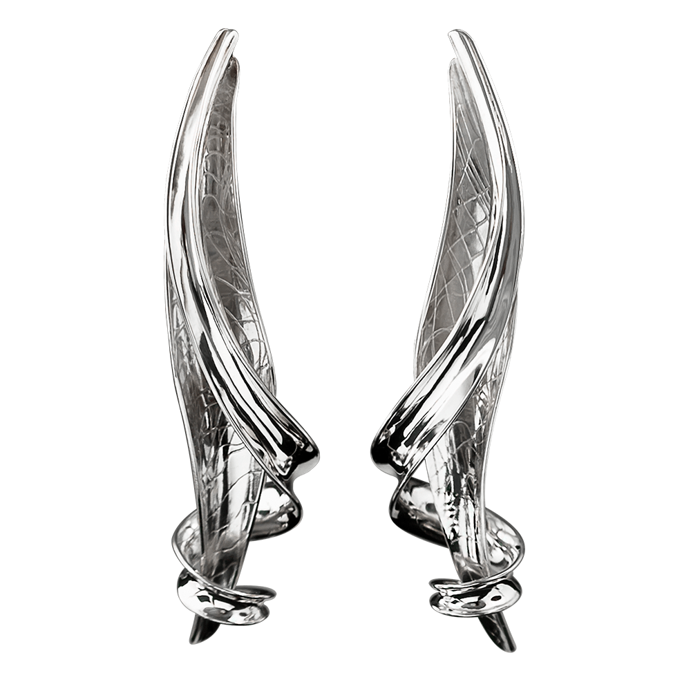 These are Long Hand Forged Textured Anticlastic Earrings. A long,graceful textured leaf form wrapped with a High Polished silver tendril.